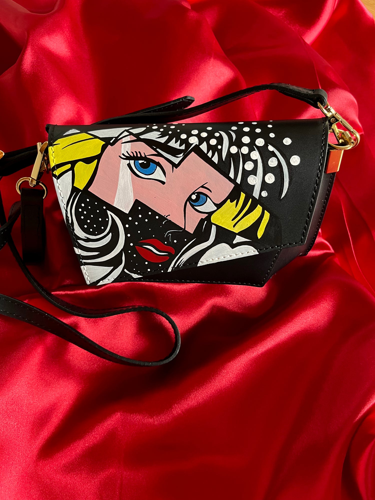 Borsetta in vera pelle colore nera opaca dipinta a mano con mini tracolla in pelle con dettagli in oro