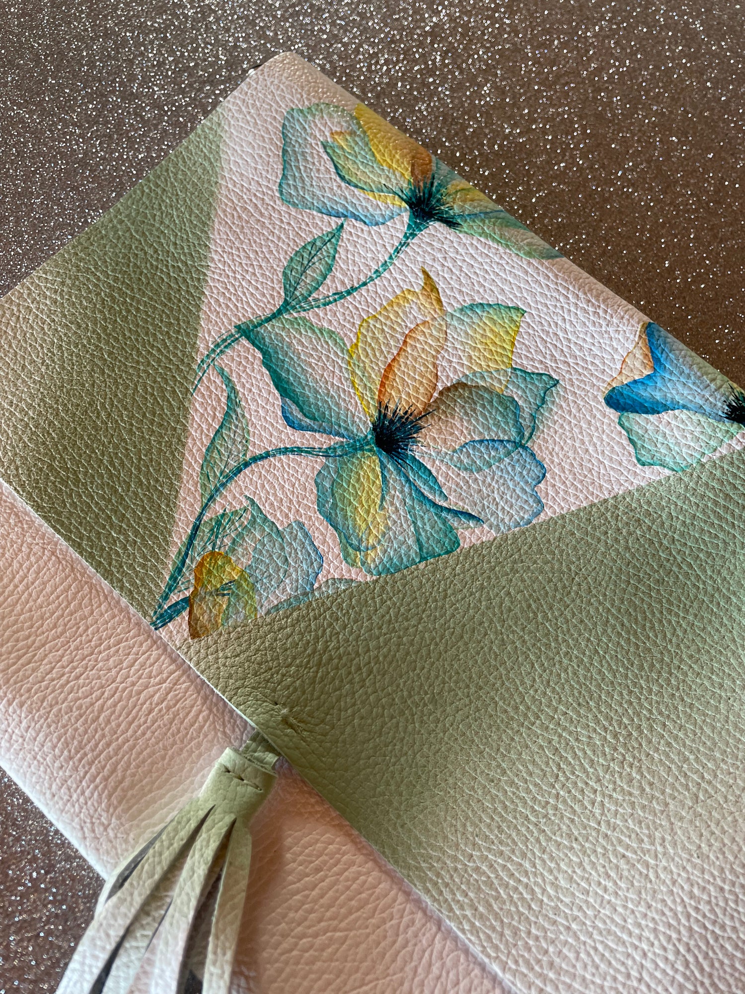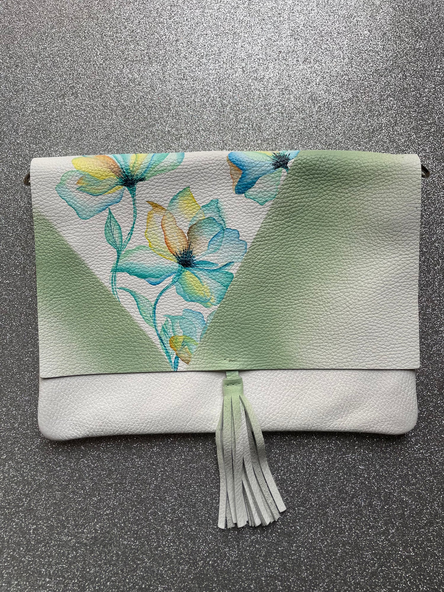 Borsetta in vera pelle di color bianco dipinta interamente a mano con tracolla in pelle. Ulteriormente personalizzabile con letter a o nome nel retro.
