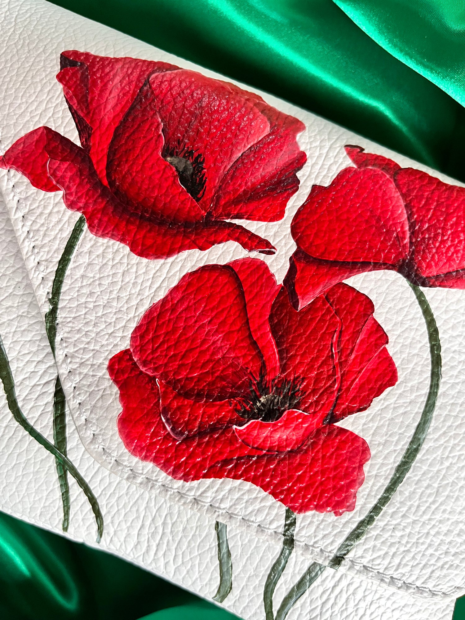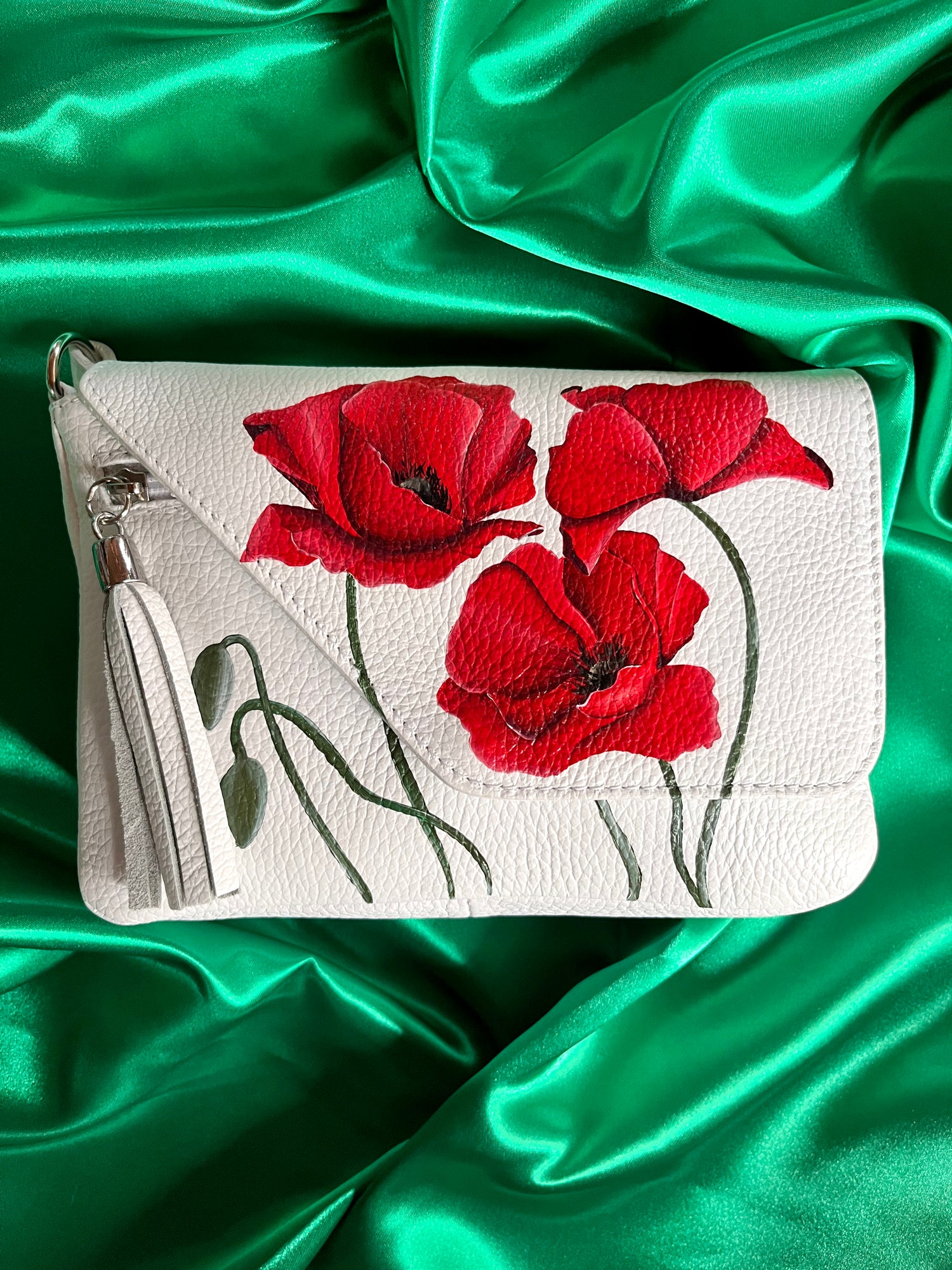 Borsetta in vera pelle colore bianco candido dipinta a mano con mini tracolla in pelle