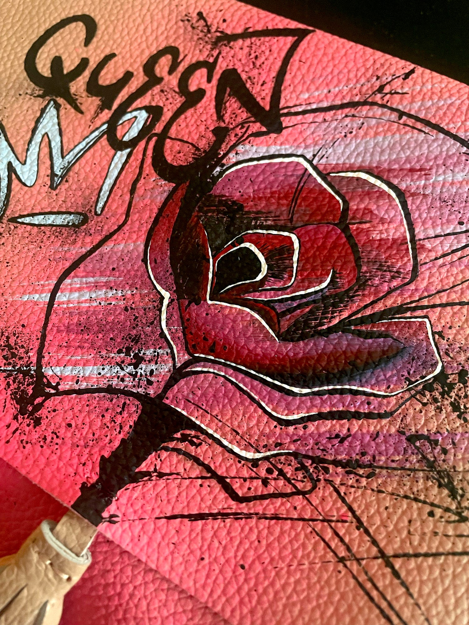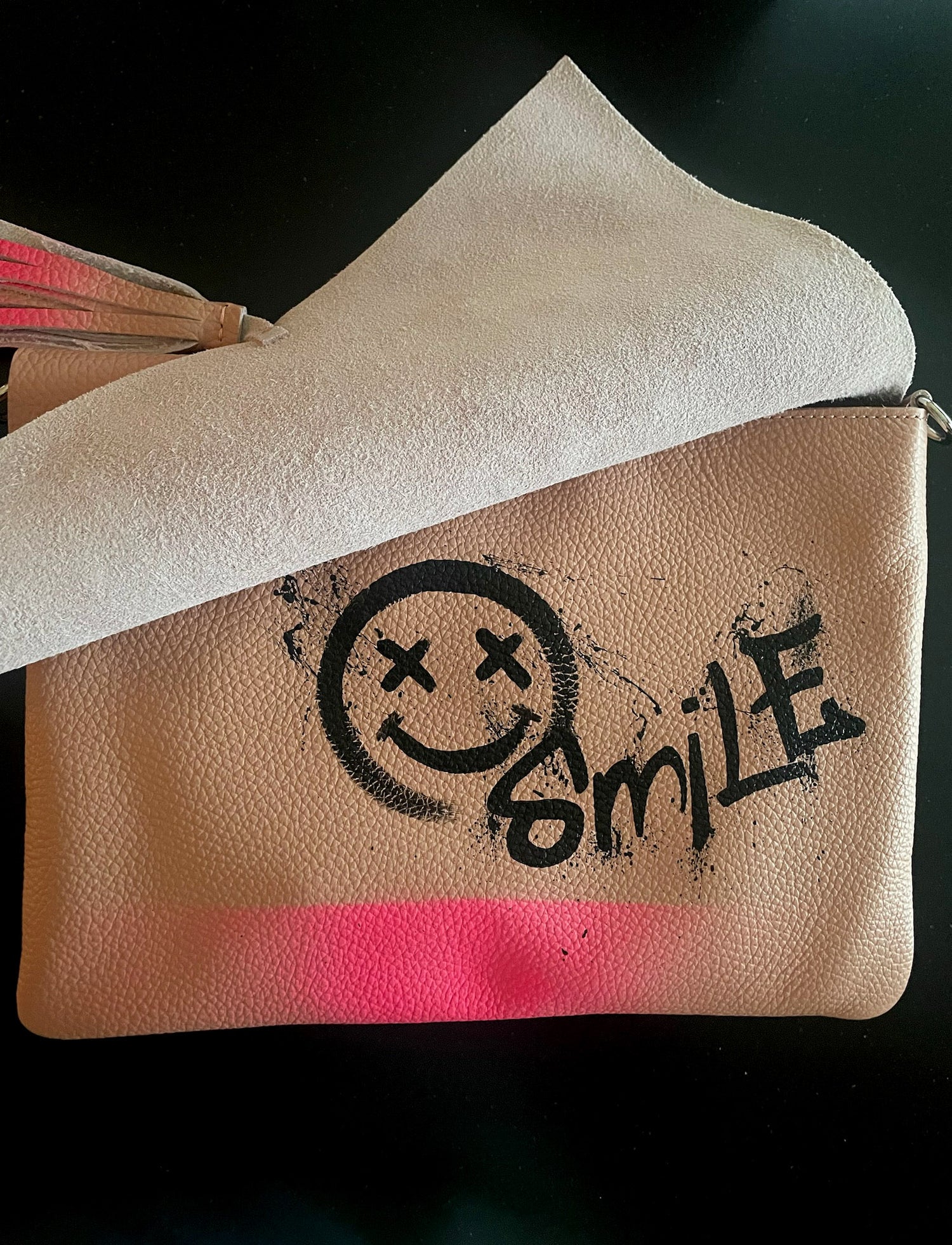 Borsetta in vera pelle color cipria dipinta interamente a mano con tracolla in pelle.