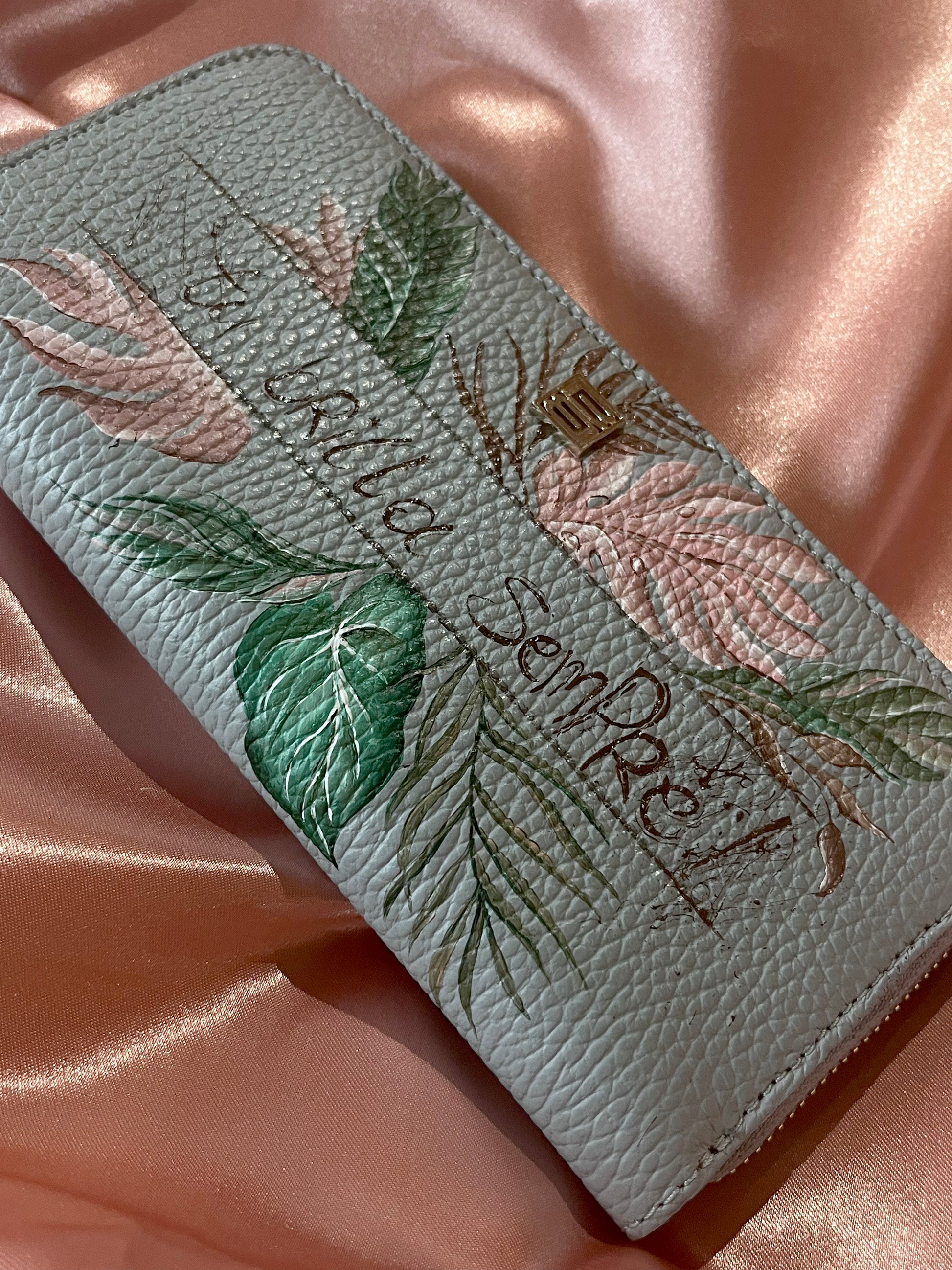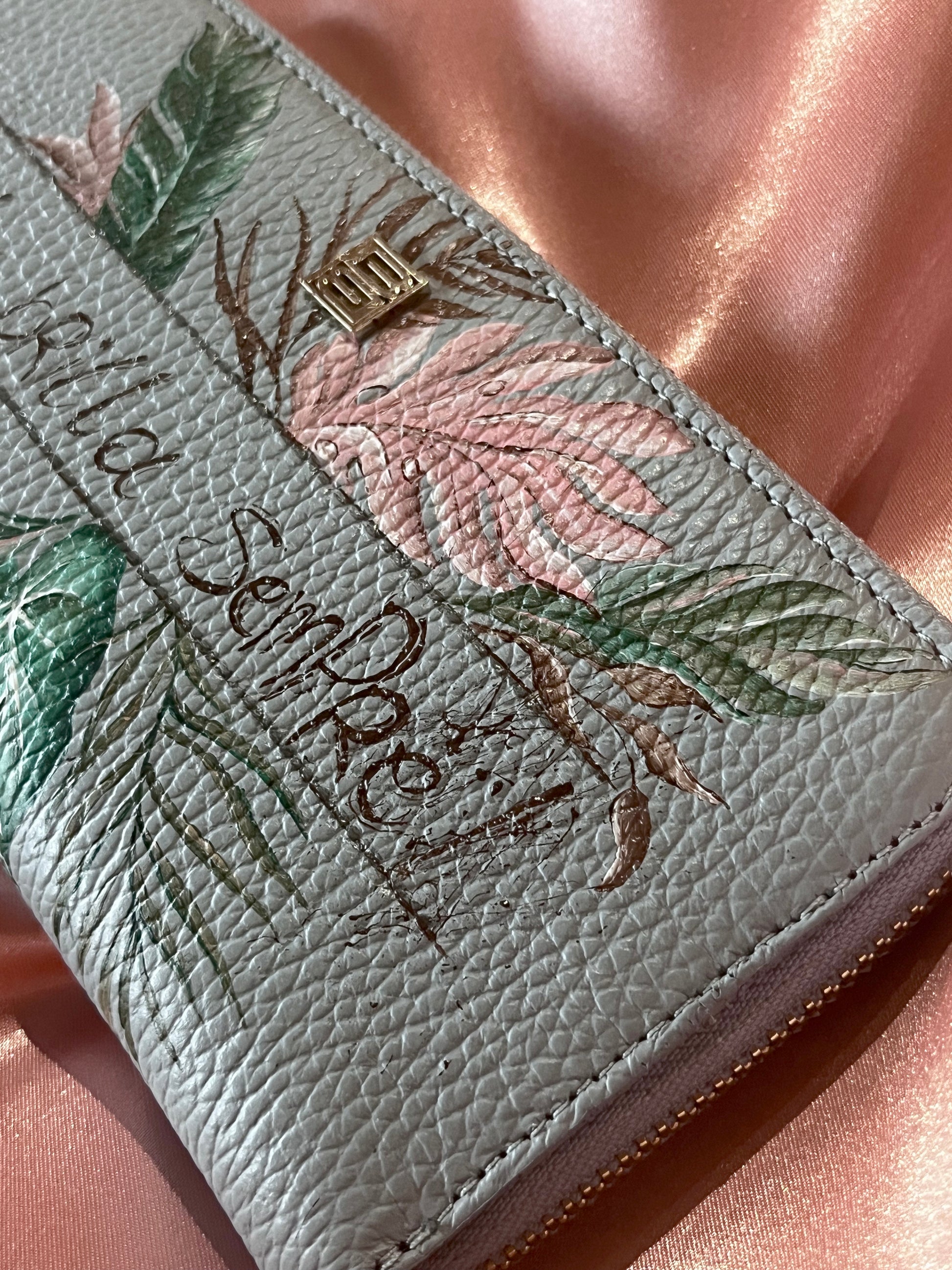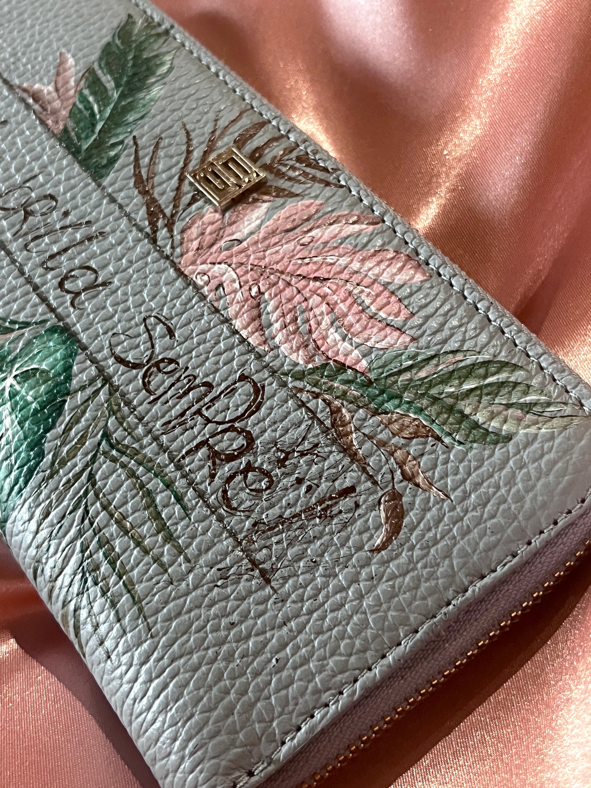 Portafoglio donna in vera pelle azzurro pastello dipinto interamente a mano